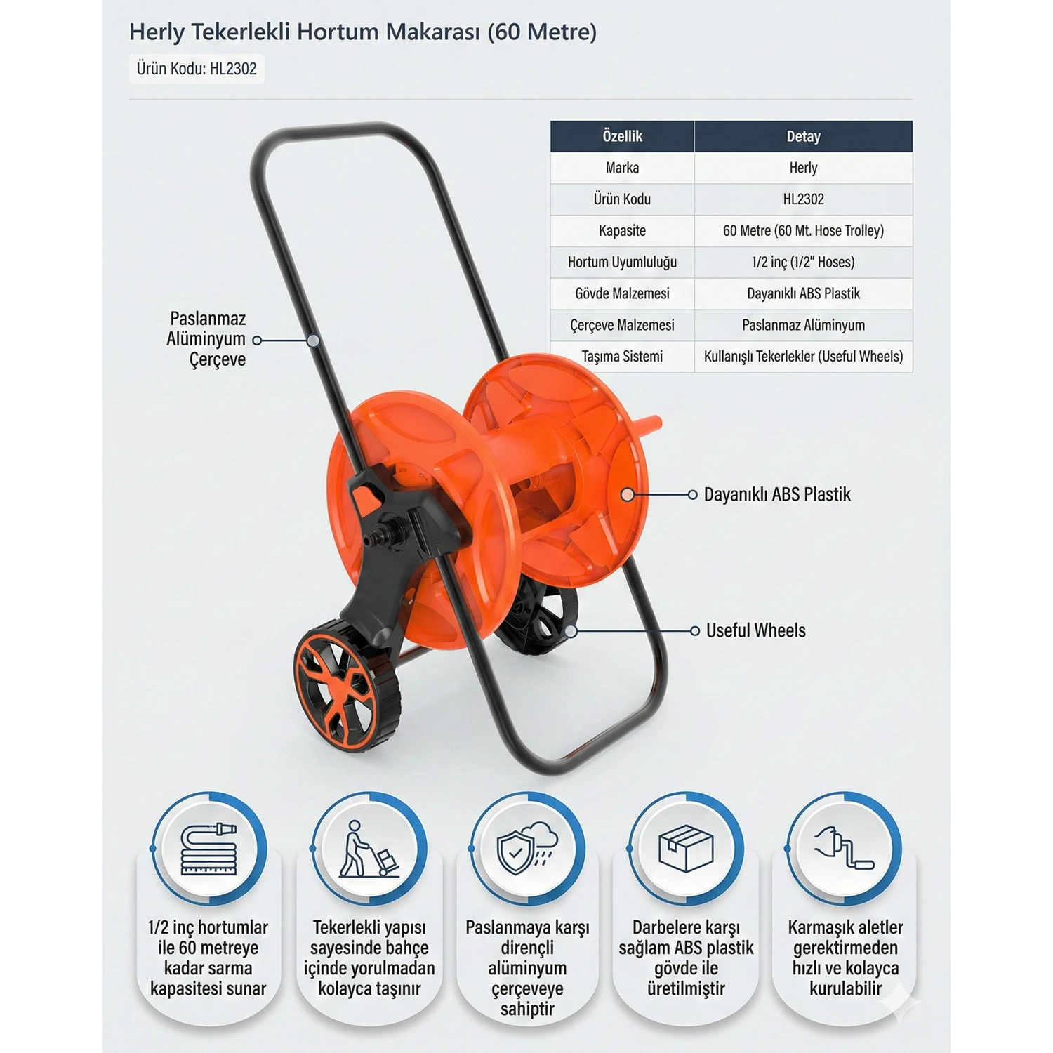 Herly HL2302 Tekerlekli Hortum Makarası, bahçe, ev, araç yıkama ve evcil hayvan bakımı gibi çeşitli sulama işlemlerinizde hortum karmaşasını ortadan kaldıran, tekerlekli yapısıyla taşıma kolaylığı sunan pratik bir çözümdür. Ürün, 1/2 inç çapındaki hortumlarla tam uyumlu olup maksimum 60 metreye kadar hortum sarma kapasitesine sahiptir.