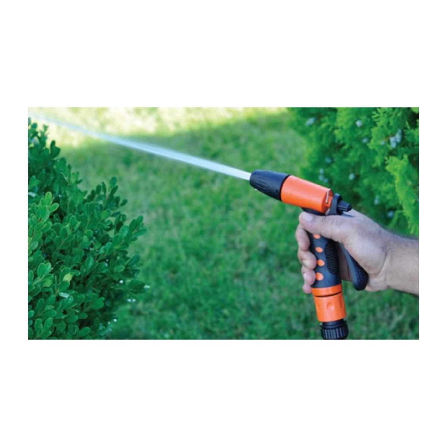 Setin ana parçası olan otomatik tabanca, ucundaki ayarlanabilir mekanizma sayesinde suyun akışını kolayca değiştirmenize olanak tanır. İhtiyacınıza göre hassas "Sis", geniş "Yağmurlama" veya güçlü "Tazyikli" sulama modlarını kullanabilirsiniz. Ergonomik sap yapısı ve arka tetik mekanizması konforlu bir kullanım sağlar.